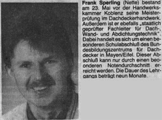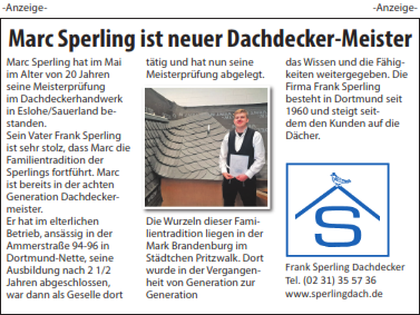 1988 gründete Frank Sperling gemeinsam mit seiner Frau Marina sein eigenes Dachdeckerunternehmen. Seit diesem Zeitpunkt ist er in der siebte Generation als Dachdeckermeister tätig. Und so konzentriert Sperling seit jeher alle Aktivitäten auf den Dachbereich. Kunden kommen zu Sperling, weil sie hier alle erdenklichen Arbeiten an ihren Dächern ordentlich ausgeführt bekommen. Bekannt ist, daß fähige Handwerker unseren Kunden mit Rat und Tat zur Seite stehen. Gute Mitarbeiter sind das wertvollste Kapital eines Unternehmens.